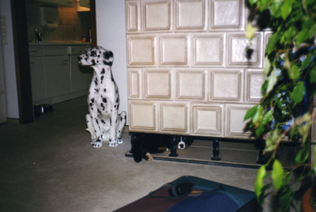 Am 24.11.99 war es soweit. Bruno durfte in sein neues Heim. Eine ruhige Höhle war schnell gefunden unter dem Kachelofen (Jedenfalls für ca. 3 Wochen).